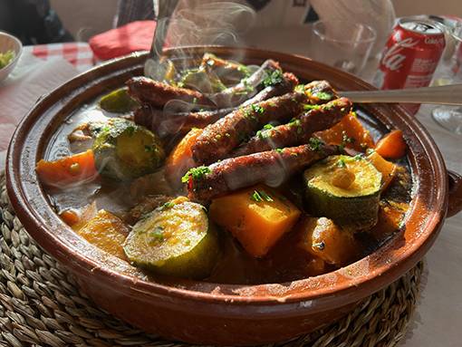 La presencia de antiguos europeos argelinos es notoria en esta zona de media montaña en el interior, y de aquí es una de las principales fábricas de cuscús en nuestro país, así que tiene su lógica que Caty sea famosa por ese plato magrebí. Este es un cuscús royal, muy sabroso, con merguez (salchichas de carne de cordero), cordero, pollo, verduras, garbanzos y salsas aromáticas.