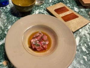 No hace ni un mes que Ca Seko ha abierto, así que todo está en rodaje. López es un cocinero autodidacta, formado sobre la propia práctica. Su recorrido empezó siendo muy tradicional, en Salamanca, la Rioja y el País Vasco, dominando la cocina de los asados y las parrillas a las brasas, así como las buenas verduras de la Ribera del Ebro. De allí al vivero vanguardista que supuso El Poblet del genial Quique Dacosta bajo el padrinazgo entonces de Tomás Arribas. Más tarde, a la nueva enseña de Arribas, el Peix & Brases, desde el que se otea el puerto y donde en 2021 consigue la primera y única estrella que ha venido revalidando todos los siguientes años. Allí conoce a la cocinera y pastelera ucraniana Zoriana Hlovak, de la región multicultural de Lvov. Zoriana, una cocinera de alta precisión, ganó hace unos años el premio del concurso gastronómico de cocina con cítricos del Huerto Todolí en Palmera.