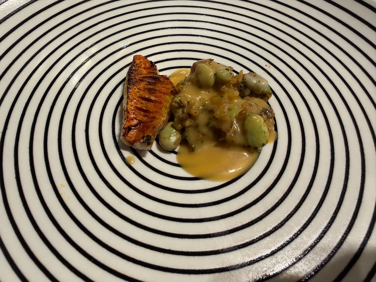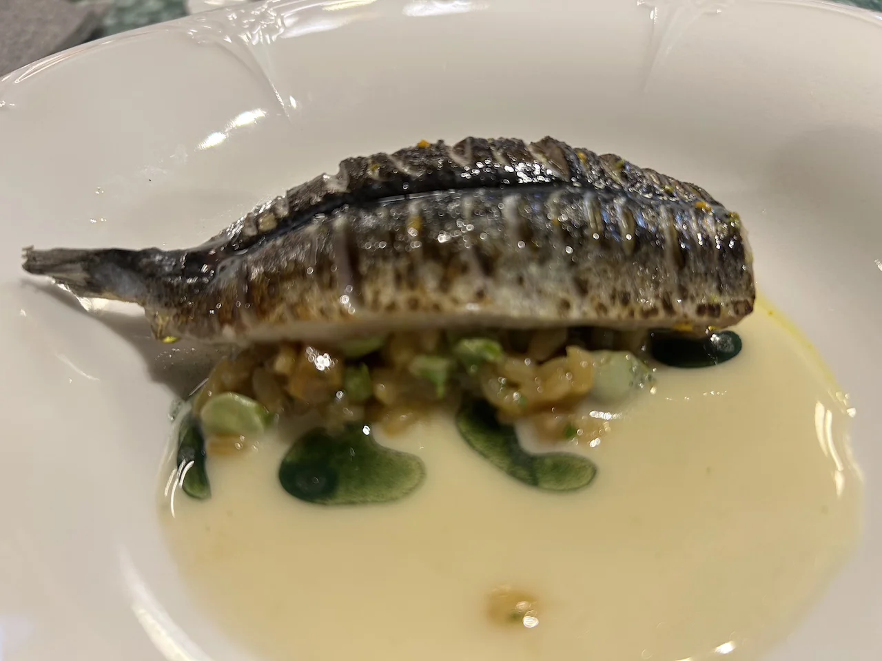 Llegamos al arroz que no puede faltar en ningún restaurante de la Comunidad Valenciana. Un arroz con habitas muy tiernas y apenas cocinadas con crema de menudillos y cebolla asada, al que según y como le añade un toque de morcilla de calabaza, típica de su tierra extremeña, y una ligerísima salsa de perejil. El arroz está sabrosísimo y muy equilibrado, tanto en su textura como en su juego de colores. La ración se cubre con un lomo de un pescado de pequeño calibre, un salmonete o un boquerón, según el mercado. En el ajuste del pescado con el arroz está el que este sea un plato de diez que camino lleva de serlo.
