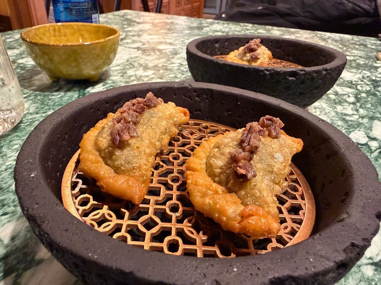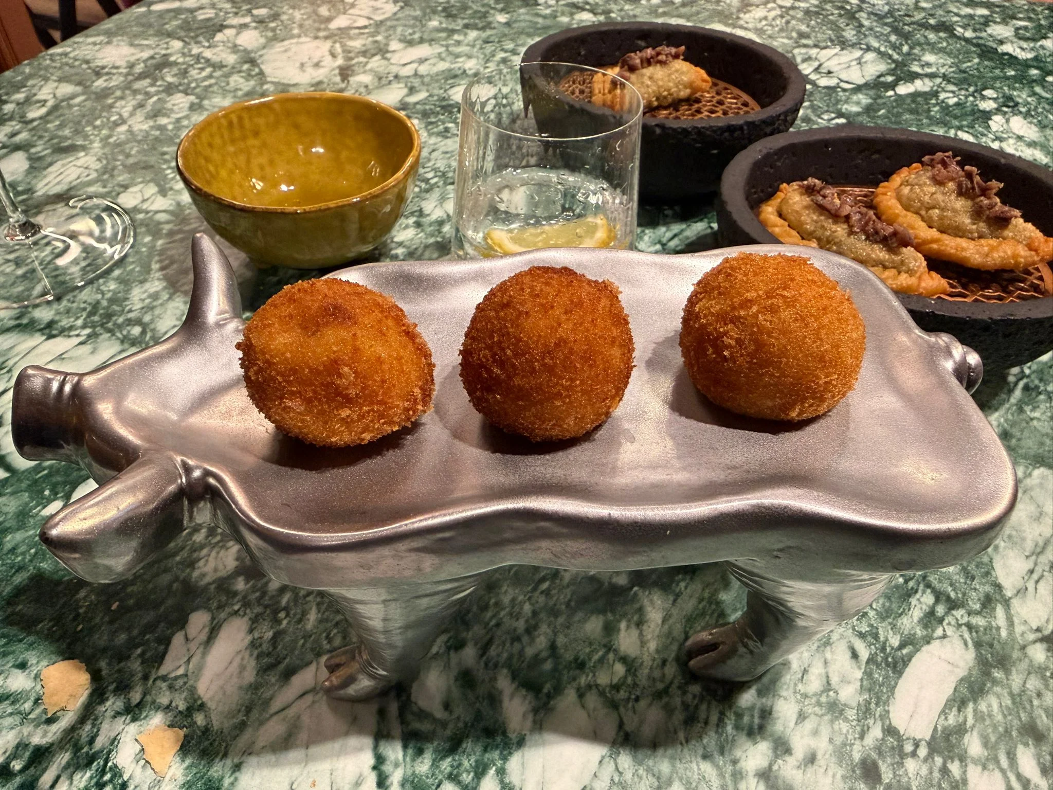 Empezamos ya en serio con una pequeña empanadilla de espinacas que remata a modo de pespunte una crema de anchoas. La empanadilla recuerda a los ancestrales minxos del interior de la Marina, con pasta de harina de trigo frita –lo que también resuena a los pestiños extremeños–. La clave es que no esté aceitosa y mantenga su textura crujiente y ligera. Lo consigue. Junto a ella, unas croquetas de bacalao con calabaza asada, equilibradas, cremosas, ni dulces ni saladas, en un punto muy conseguido.