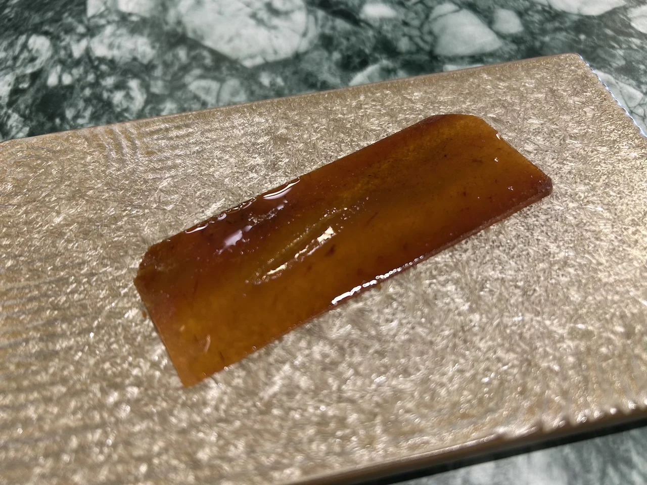 El siguiente dueto lo conforma una lámina de hueva de xerna (mero de profundidad, en general más carnoso y grande que el de roca) con una versión sui generis de José Manuel López de la tradicional titaina del Cabanyal valenciano. Digamos de la hueva que es original y está muy buena, pero no tenemos muy claro que valga la pena el enorme esfuerzo de buscar huevas en las xernas, pues no son tantos los ejemplares que llegan a la lonja dianense.