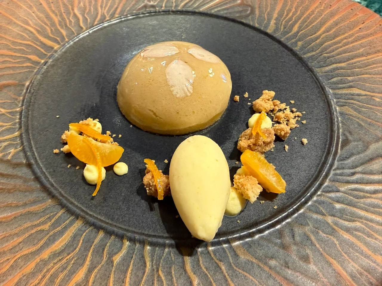 El final es el postre ganador del premio citrícola que prepara con una gran finezza Zoriana Hlovak. Un postre extraordinario, con la almendra laminada rematando un finísimo pastelito a modo de mochi relleno de crema, con helado, gajos cítricos y ese sabor característico del dragonfly que semeja fruta de la pasión y un remate perfecto del kumquat o fortunella cuya piel es más gustosa que la carne.